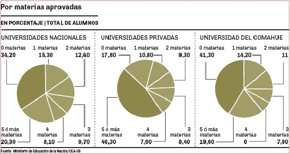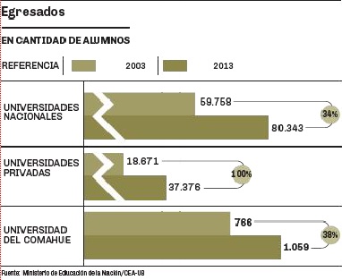 Los números que resultan de este cociente son muy difíciles de digerir. En las universidades públicas nacionales se ubica en el 27%, es decir, de cada cuatro estudiantes que ingresan sólo alrededor de 1 es el que termina con su título. En los claustros privados este valor salta al 41%, mientras que en la Universidad Nacional del Comahue (UNC) apenas llega al 15%.