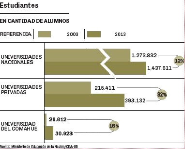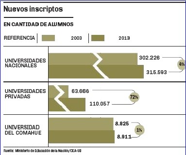 Los gráficos adjuntos muestran también cómo ha sido el avance de las universidades privadas en estos últimos años. Se observa un crecimiento muy importante en la cantidad de estudiantes, nuevos inscriptos y graduados, muy por encima de las tasas registradas en los claustros estatales. Dato a tener en cuenta: en términos absolutos, las universidades privadas representan solo el 22% de la matrícula universitaria. Sin embargo, ese mismo año las privadas aportaron un tercio de los graduados: 39.079 profesionales contra 81.552 en las públicas.