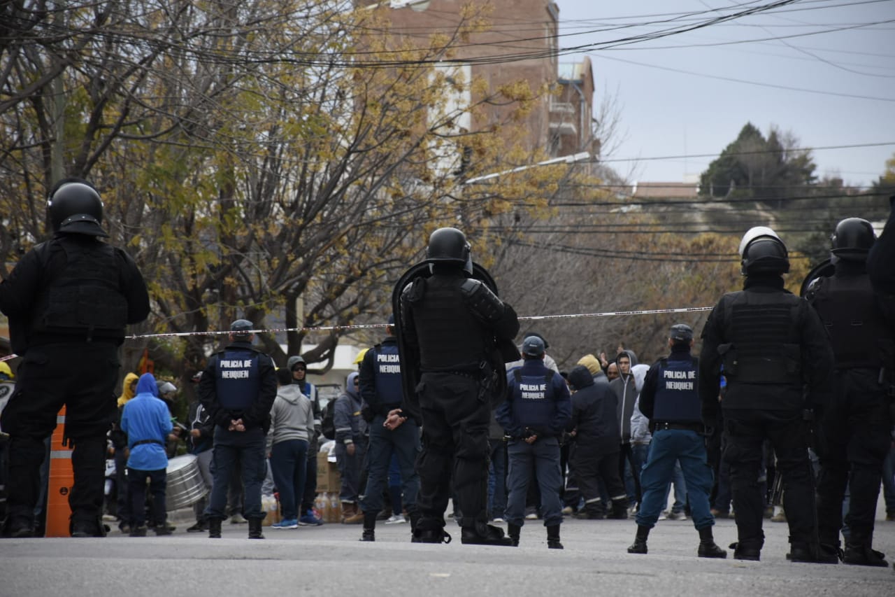 Hay manifestantes en la calle y una valla custodiada por efectivos de la policía. Piden ingresar alimentos a los compañeros que están en el interior de la sede.