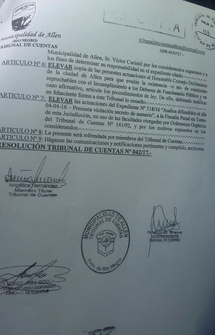 También se ordena desarchivar el expediente 499/15 “Sobreprecios bancos Plaza Integración”, para continuar con el juicio de responsabilidad contra Curimil, y que se envíe copia de lo actuado a la Fiscalía penal en turno y al Concejo Deliberante, para que éste último evalúe si existió incumplimiento de deberes de funcionario publico.
