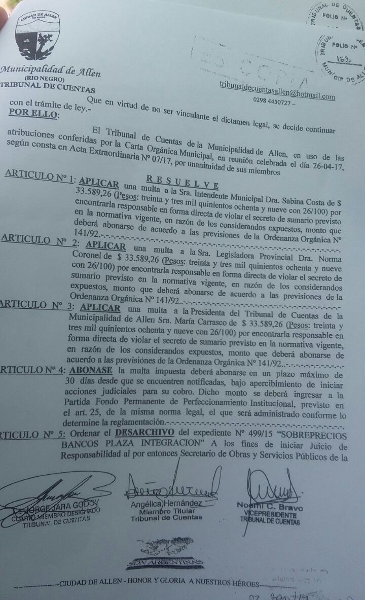Según la resolución a la que “Río Negro” pudo acceder, N° 042/17, se les ordena abonar a cada una la suma de 33.589 pesos, en un plazo de 30 días a partir del momento en que sean notificadas. De no cumplir, se podrían iniciar acciones legales para asegurar el cobro.