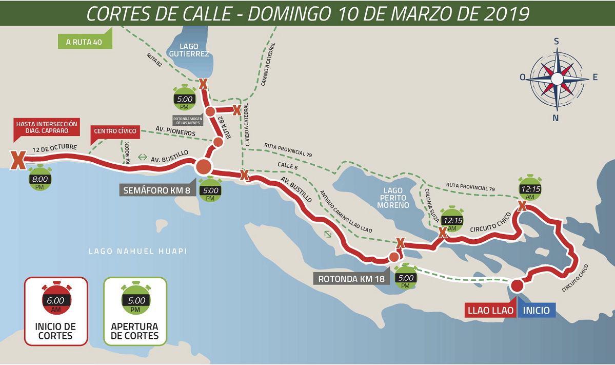 - Si vivís del lado del Nahuel Huapi y querés salir hacia el centro deberás dejar tu vehículo del otro lado de la ruta hacia los caminos alternativos. No se podrá circular por Av. Bustillo, la misma será puesta en condiciones para la carrera.