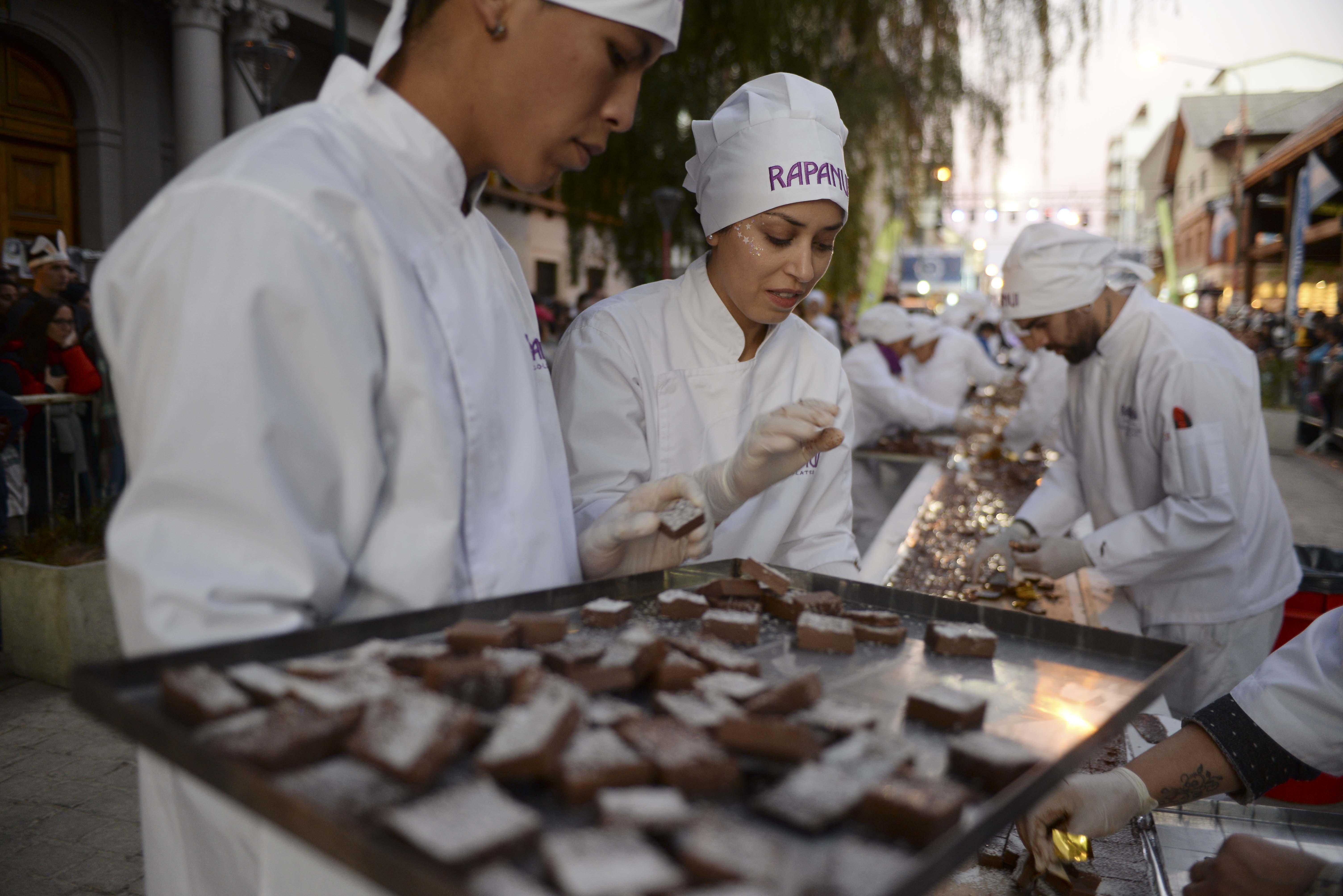 En la elaboración de la barra trabajaron 100 maestros chocolateros y 80 estudiantes de la Escuela de Hotelería y Gastronomía de Bariloche, un secundario del estado provincial que ofrece una orientación técnica particular vinculada a la actividad turística y la cocina.