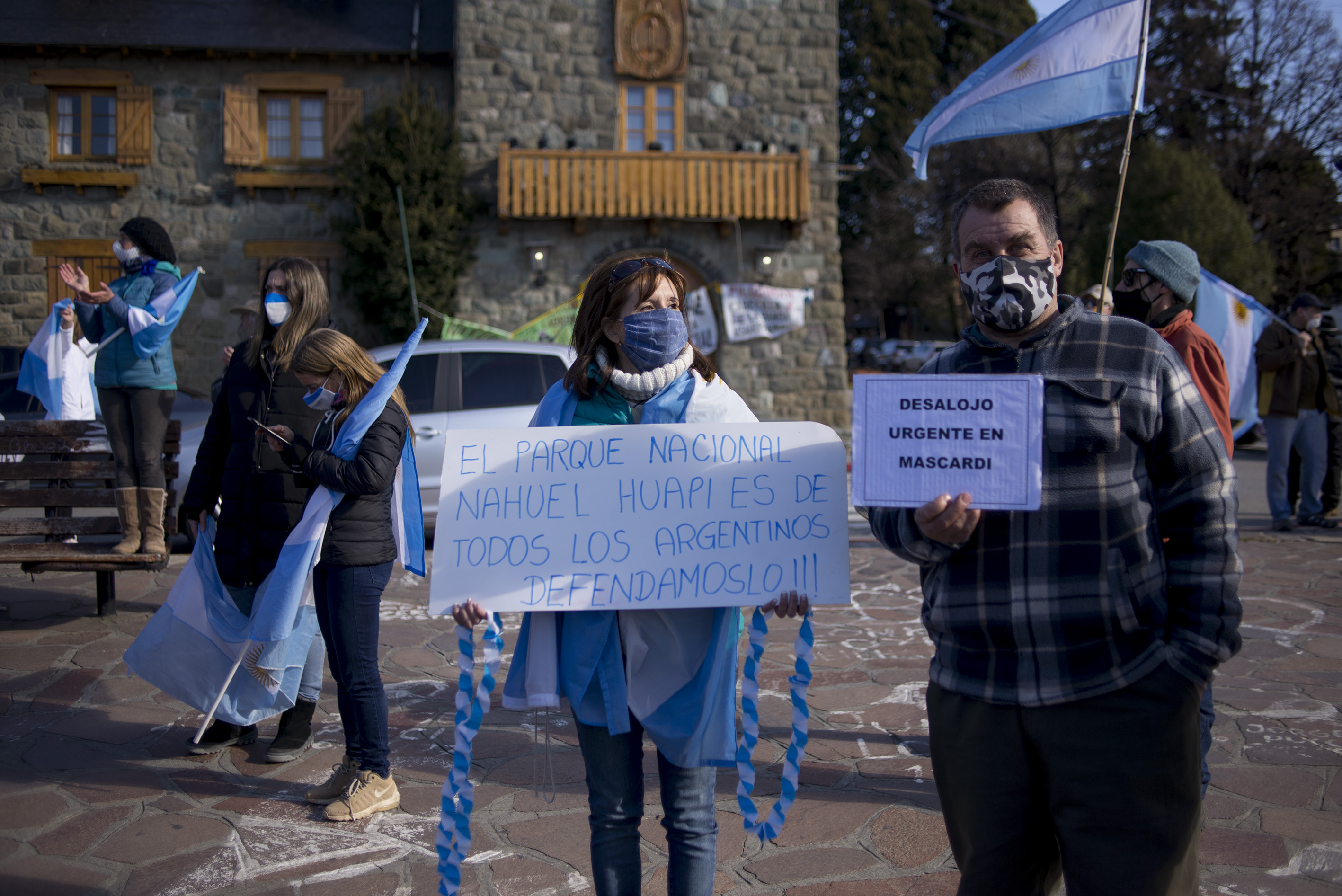 Vecinos autoconvocados por Villa Mascardi participaron de la manifestación y aprovecharon la marcha nacional para reiterar los reclamos al gobierno nacional para que resuelva el conflicto por la toma de tierras en esa zona, distante a unos 35 kilómetros al sur de Bariloche. Además, pidieron la defensa del Parque Nacional Nahuel Huapi.