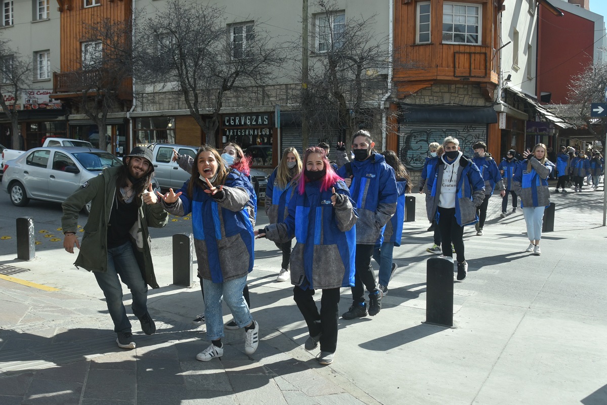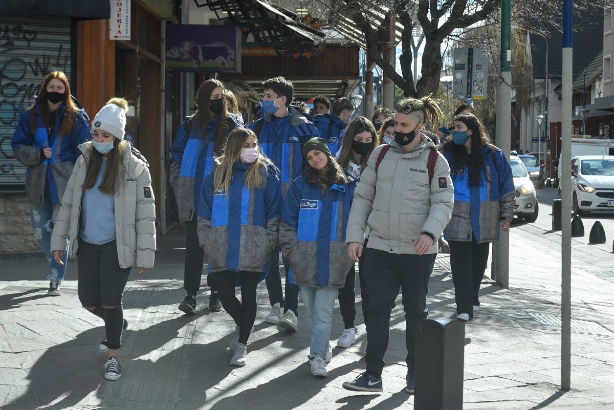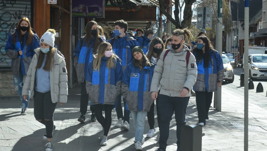 La presencia de los estudiantes en las calles de Bariloche es un clásico. Con sus cantos y sus atuendos con las marcas de las empresas de viajes, decoran la vida cotidiana.
