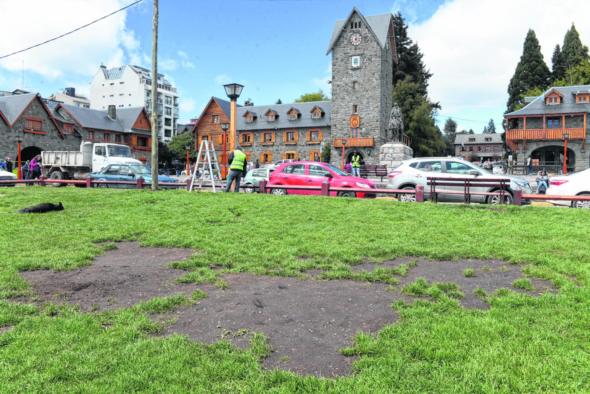 Abandono de los jardines. El uso intensivo de los espacios parquizados impide mantenerlos bien. La presencia de una feria artesanal obligó hace años a reemplazar pasto por pedregullo en el lateral sobre calle Urquiza. En otros sectores abundan las plantas y el césped en mal estado.