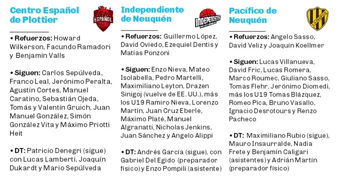 El que menos tocó su plantel fue Pacífico y esto tiene una explicación: fue el mejor de estas tierras en el último Federal y se metió entre los mejores ocho del país. En Roca, Del Progreso se renovó para rodear de otra manera al habitual MVP, Gustavo Maranguello; y el Depo mantuvo su base y confía en ese buen ojo que siempre tuvo Sebastián García a la hora de elegir refuerzos.