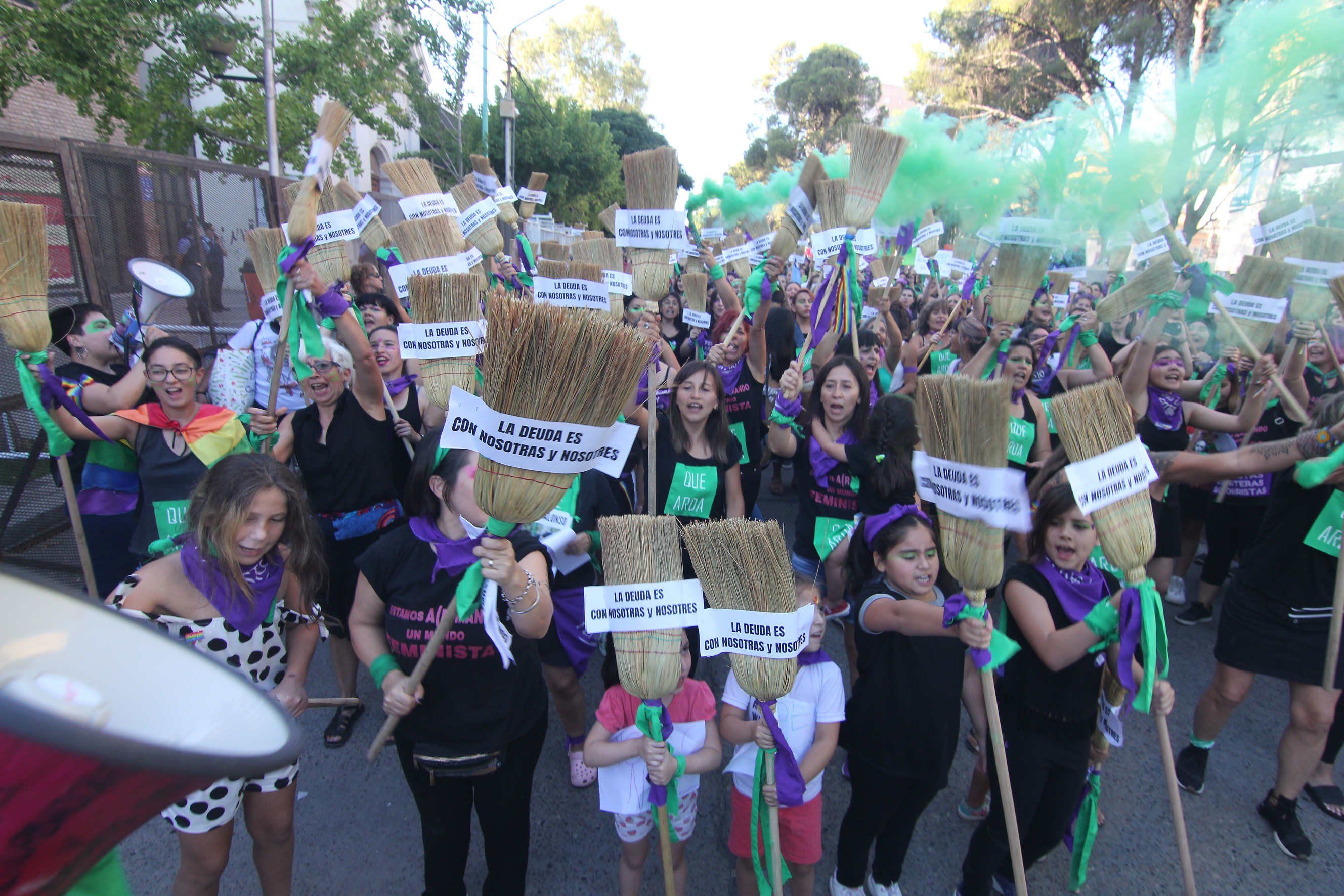 La consigna que encabezó la marcha fue pegada en miles de escobas de paja: “La deuda es con nosotras, ni con el FMI, ni con las iglesias”.