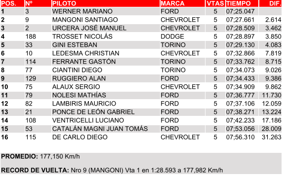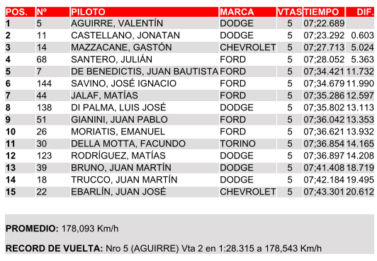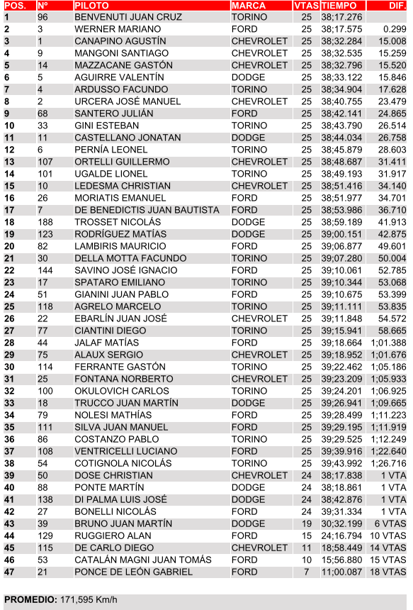 En segundo lugar quedó el tetracampeón Agustín Canapino, quien finalizó a 1s 46/100, lo que demuestra el gran auto que tiene Benvenuti, que edificó una buena ventaja en pocas vueltas.