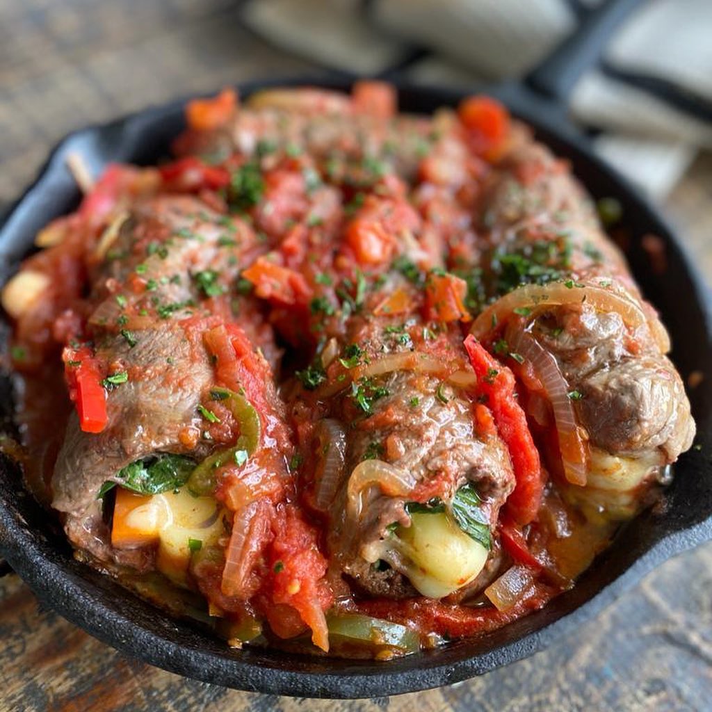 6- Rectificar los condimentos y terminar con perejil picado. Cortar las papas en rodajas finas y freír en aceite caliente. Servir junto a los arrollados de bifes a la portuguesa.