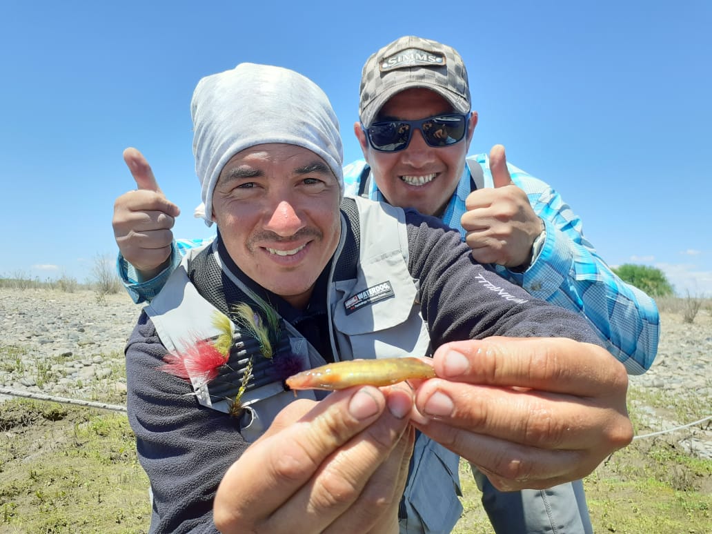 El bagrecito del Limay Medio también tuvo su foto. Lucho y Diego le ponen onda.