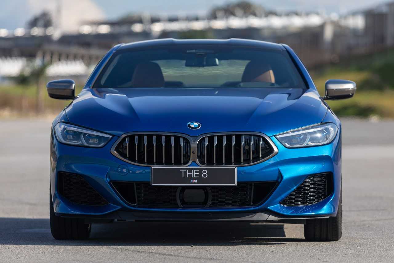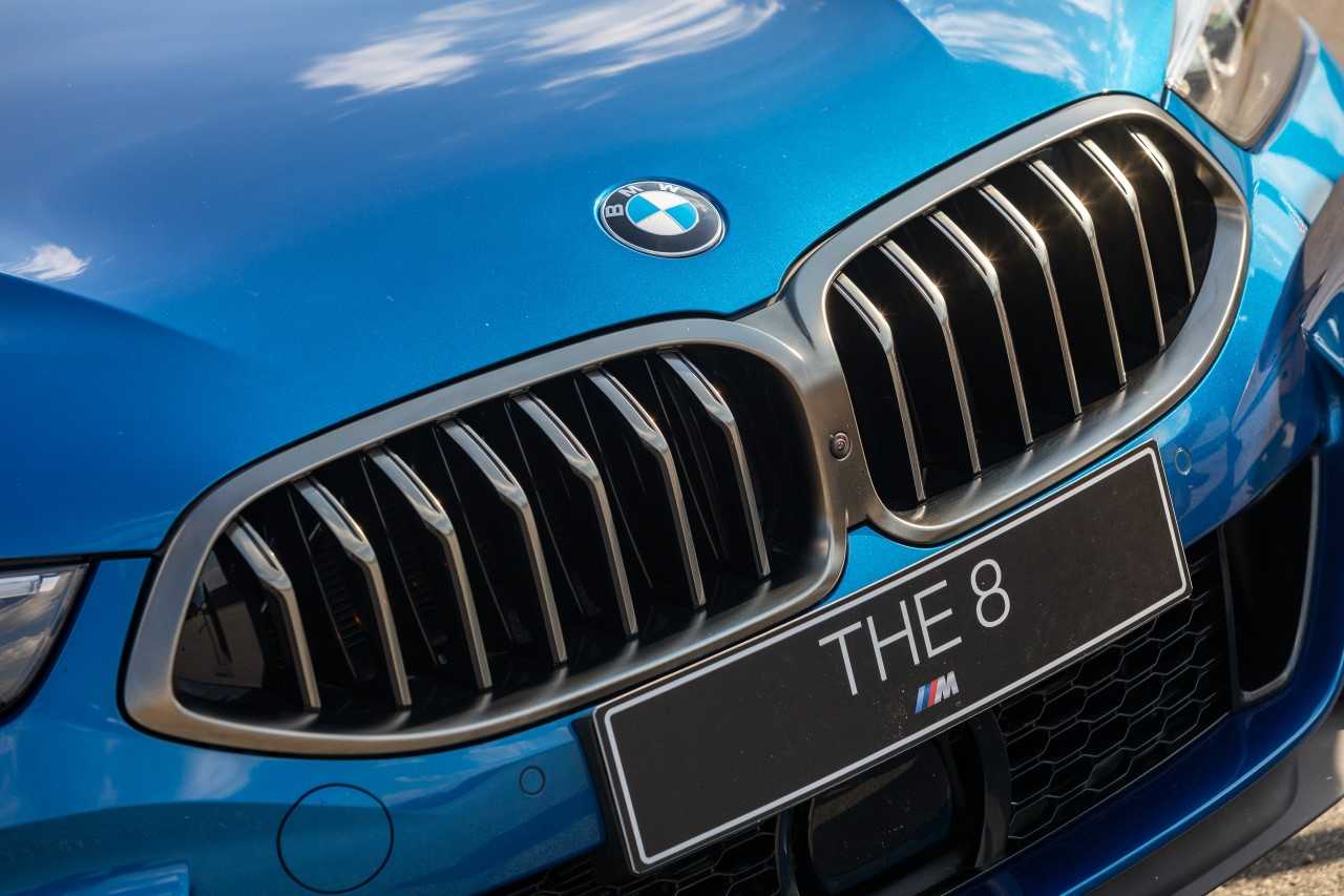 La potencia motriz se materializa con un efecto imponente de la parte delantera, las largas entradas de aire las cuales asumen un aspecto aún más imponente en el BMW M850i xDrive Coupé, y los contornos precisos del capot. La parrilla frontal doble en forma de riñón, típica de BMW, es hexagonal, con sus elementos enmarcados con un entorno de una única pieza. Los faros delanteros LED son los más delgados de cualquier modelo BMW hasta la fecha. Introducen luz láser BMW con iluminación variable del camino y Selective Beam.