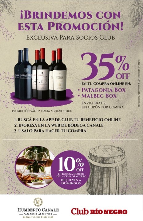 La bodega Humberto Canale y Club Río Negro se unen una vez más para brindar una promoción exclusiva para Socios Club. La misma consiste en un descuento de 35% en la compra de un box con 6 botellas de vino de calidad premium. A ello se suma otra opción de un 10% de descuento en el valor de los vinos que acompañen una cena o almuerzo dentro de la bodega válido para los días jueves a domingos. A este beneficio se accede a través de un QR que se encuentra en la bodega, el cual deberán escanear con la app de Club Río Negro.