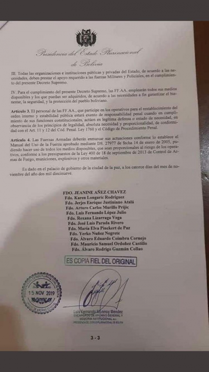 “El grave decreto de #Bolivia desconoce los estándares internacionales de DDHH y por su estilo estimula la represión violenta. Los alcances de este tipo de decretos contravienen la obligación de los Estados de investigar, procesar, juzgar y sancionar las violaciones de DDHH”, advierte el organismo en un mensaje en su cuenta de Twitter. Junto al mensaje publicó las tres hojas del decreto 4078, aprobado el 14 de noviembre con la firma de Áñez y de 11 de sus ministros.