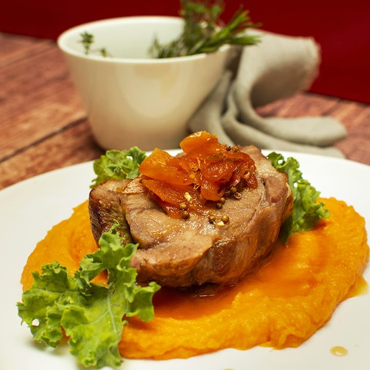 Bondiola de cerdo con chutney de yatay y puré de batatas