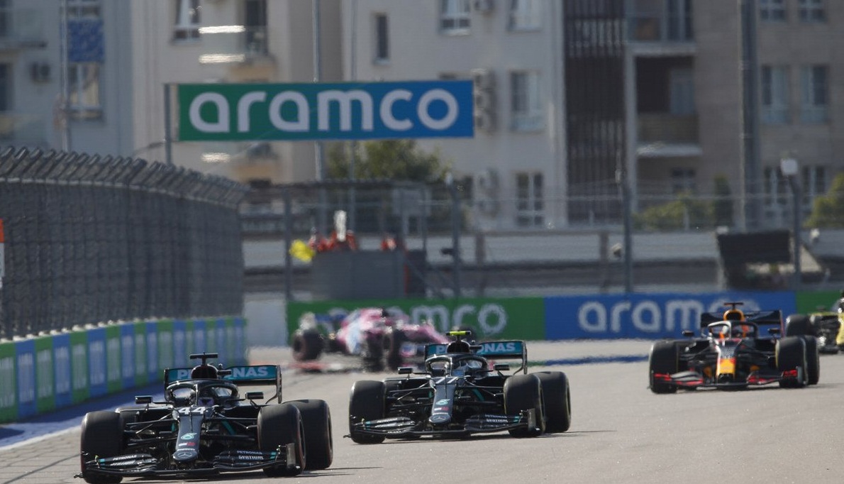 Bottas, desde el tercer lugar, le ganó a Verstappen al inicio e incluso llegó a amenazar la posición de Hamilton en la curva 2, aunque quedó por fuera y no pudo concretar la maniobra.