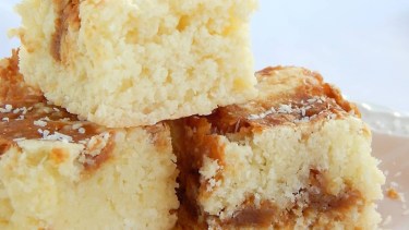 En un recipiente cascar los huevos y combinar con azúcar (solo hasta homogeneizar, no necesitás batir). Perfumar con extracto de vainilla y añadir el coco rallado. Finalizar integrando la harina junto con la manteca derretida (la mezcla es algo densa). Verter en un molde forrado con papel aluminio y spray vegetal o papel manteca enmantecado y frío. Colocar algunas cucharadas de dulce de leche y con la ayuda de un cuchillo mezclar. Hornear, en horno precalentado, durante 30 a 35 minutos a 190º C o hasta que sus bordes estén levemente dorados. Dejar enfriar por completo. Cortar en cuadrados.