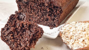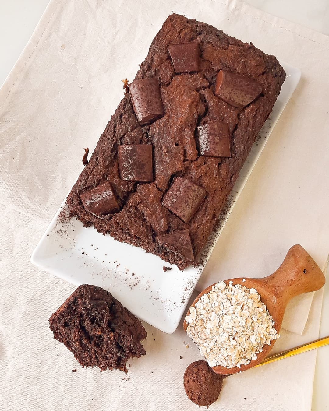 A esta mezcla le incorporamos la harina de avena (que si no consiguen la harina la pueden hacer procesando la avena que puede ser instantánea o la común), el cacao amargo, el polvo de hornear. Integramos todo y lo pasamos al molde que habíamos preparado. Por arriba colocamos pedazos de chocolate y llevamos a horno 180º C de 40 a 45 minutos. Lo sacamos, dejamos enfriar.