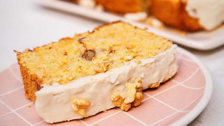 Batir los huevos con el azúcar hasta que estén espumosos. Sumar el resto de los líquidos y batir un minuto más. Incorporar los secos de a partes e integrar bien todo. Llevar 40 minutos a horno precalentado a 180º C. Una vez frío desmoldar y cubrir con el chocolate blanco derretido con el aceite y las nueces por encima. También podés cubrirlo con queso crema endulzado a gusto.