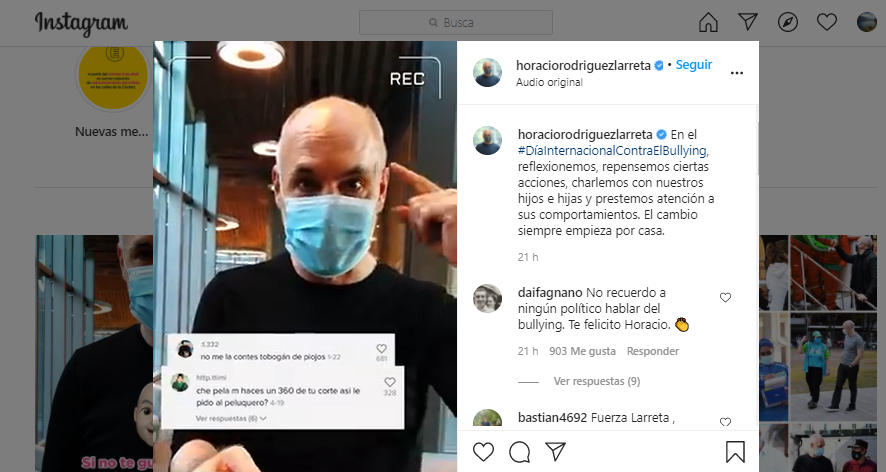 “En el Día Internacional Contra el Bullying, reflexionemos, repensemos ciertas acciones, charlemos con nuestros hijos e hijas y prestemos atención a sus comportamientos. El cambio siempre empieza por casa”, escribió Larreta en su cuenta de Instagram. La publicación fue acompañada por un video.