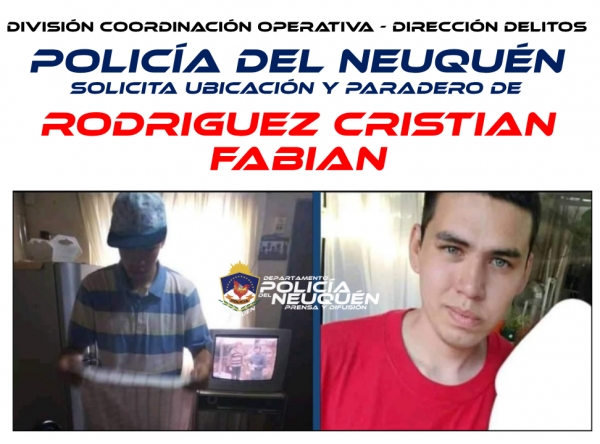 La Policía de Neuquén solicitó colaboración para dar con el paradero de Rodríguez Cristian Fabián, que está desaparecido desde el domingo 14 de marzo en Neuquén capital.