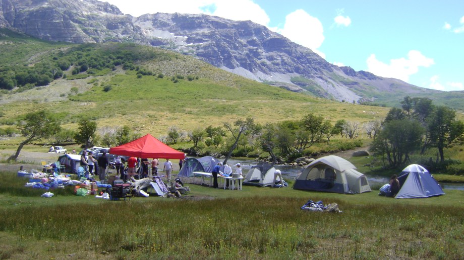 9. Llegada y armado del Campa Base. Nos dividimos en grupos, unos organizan el armado de las carpas, otros la instalación de los gazebos (comedores) , mesas, sillas, calentadores/anafes… Las provisiones que están clasificadas y etiquetadas, quedan por seguridad de animales sueltos ( perros, caranchos, roedores) en las cajas de las camionetas.