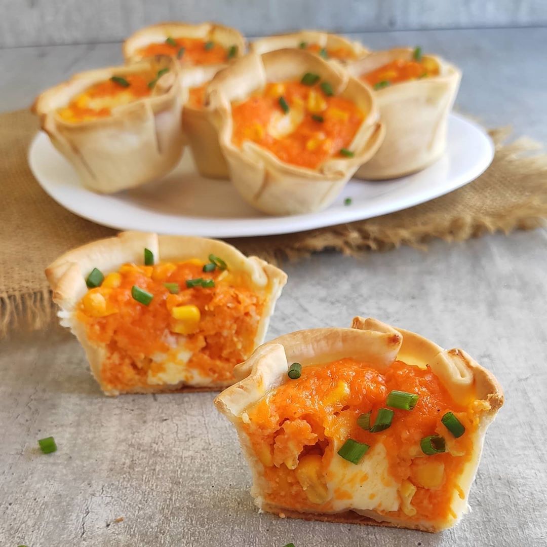 En un bol mezclar todos los ingredientes menos el queso en cubos y sobre la mano poner la tapa de empanada, rellenar e ir dándole forma (vas cerrando hasta que se forme una canastita), para que no se baje en el horno lo que hice fue ponerlas sobre un molde de muffins y les agregué un corazón de queso. Lo deje aproximadamente 20 minutos a horno medio y listo.