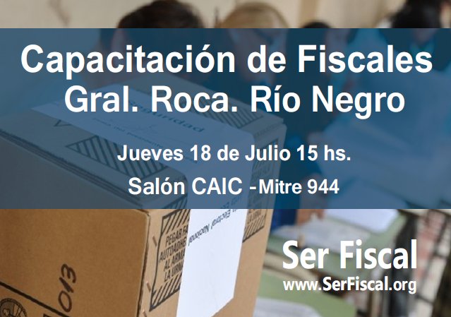 La ONG «Ser fiscal» realizará este jueves una capacitación en Roca para quienes estén interesados en controlar el acto electoral del próximo domingo 11 de agosto, día en que se realizarán las Primarias Abiertas Simultáneas y Obligatorias para la categoría presidencial y los tramos para diputados y senadores de acuerdo a cada provincia.