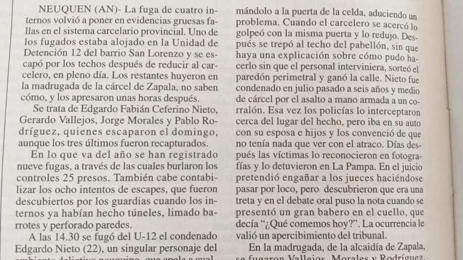 El hombre se escapó de la unidad 21 de Cutral Co en el año 2001.