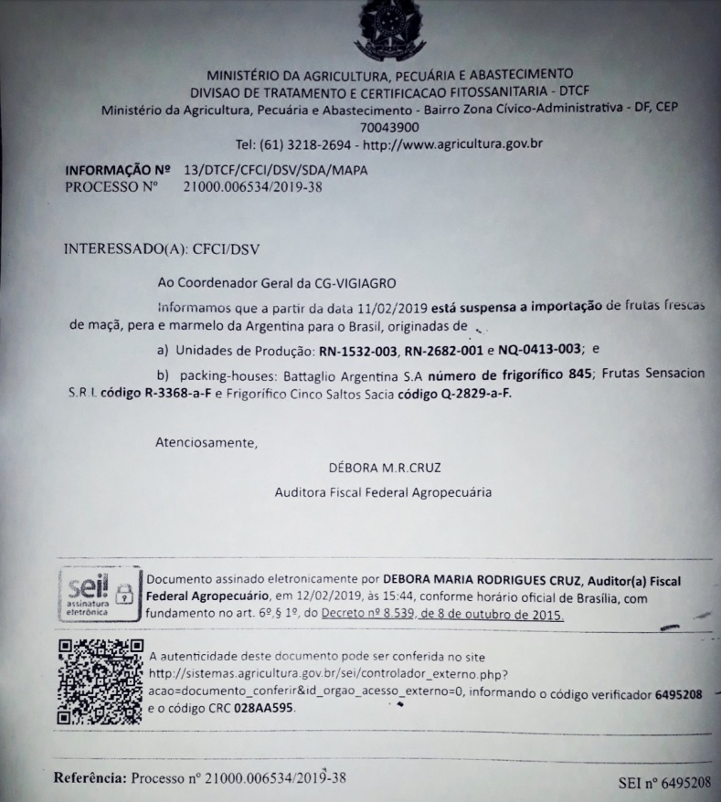 Una media docena de firmas regionales ya recibieron la carta con la suspensión de sus exportaciones hacia este destino firmada por la Auditora Fiscal Agropecuaria de Brasil, Débora Cruz. Trascendió que un nuevo transporte fue rechazado sumando, en estos primeros 45 días del año, nueve los camiones en los que fue encontrada la plaga. El tema suma incertidumbre en medio de la crisis estructural que está atravesando la actividad. Brasil hoy es el principal destino de exportación para la fruta del valle de Río Negro y Neuquén. Están en juego algo más de 120.000 toneladas de peras y manzanas por un valor FOB declarado de más de 150 millones de dólares.