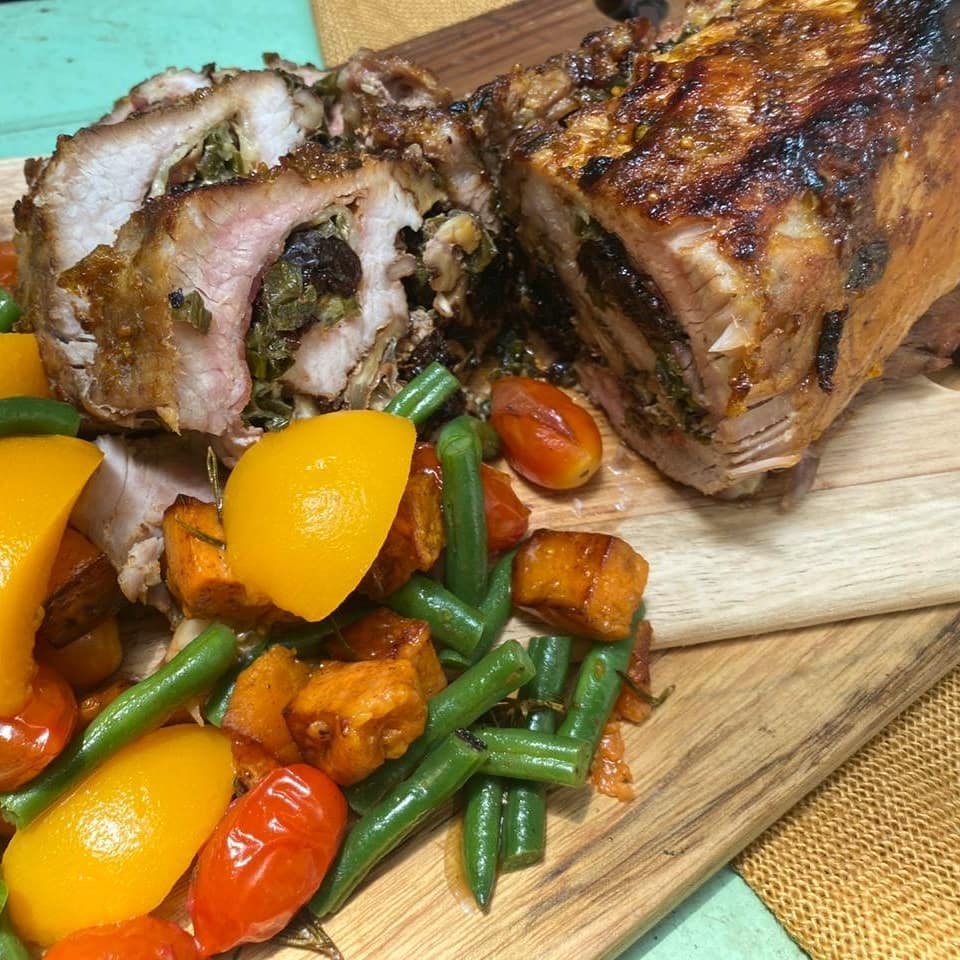 4. Abrir el carré como un matambre y salpimentar. Cubrir con panceta y ciruelas en mitades, apio picado, perejil picado y salsa barbacoa.