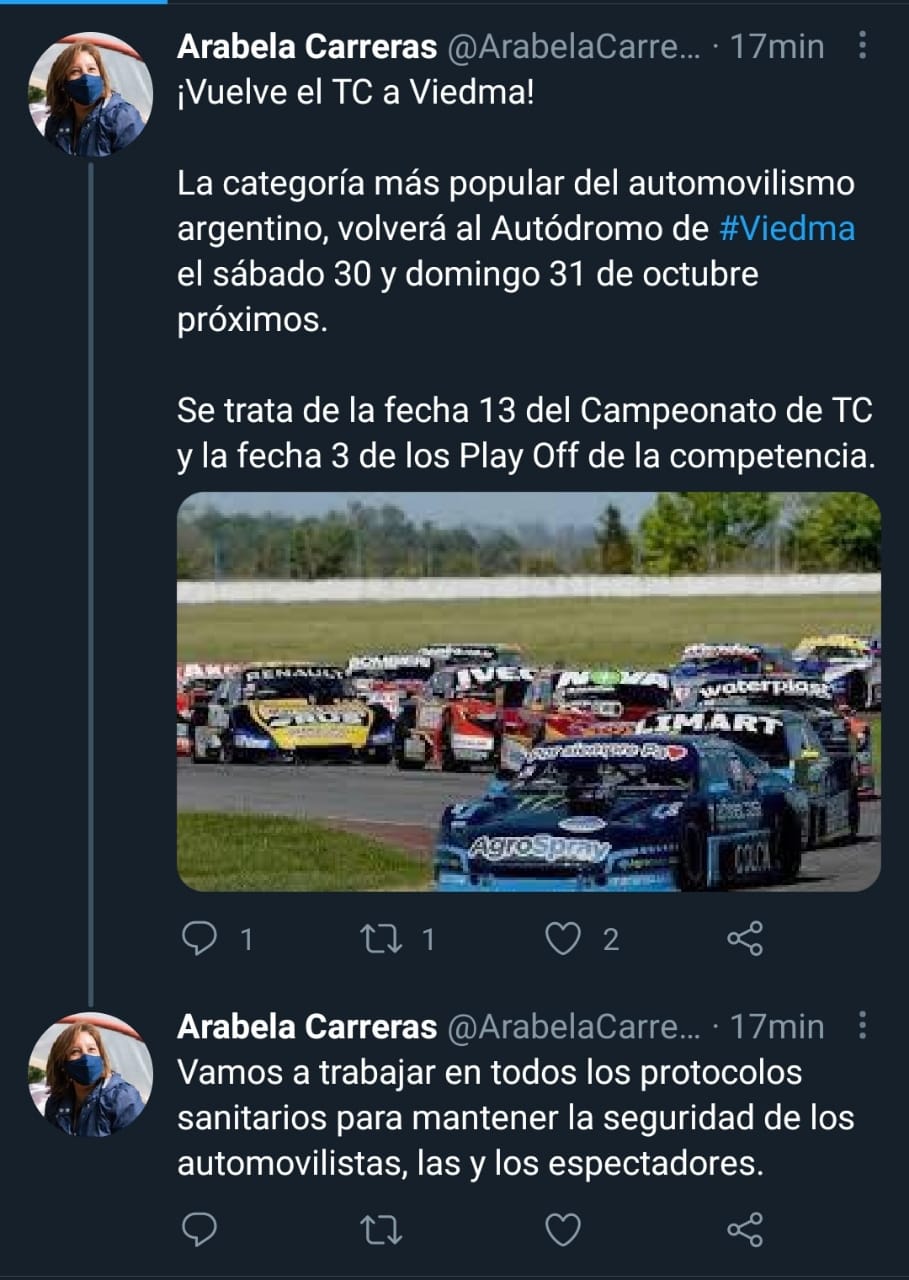 Desde hace meses se mencionó la posibilidad que el TC volviera al autódromo de Viedma antes de finalizar su certamen 2021 y ayer se confirmó por parte de Arabela Carreras, la gobernadora de Río Negro, quien a través de sus redes sociales aseguró que el 30 y 31 de octubre la categoría más importante del automovilismo argentino cumplirá la tercera fecha de la Copa de Oro en el circuito capitalino.