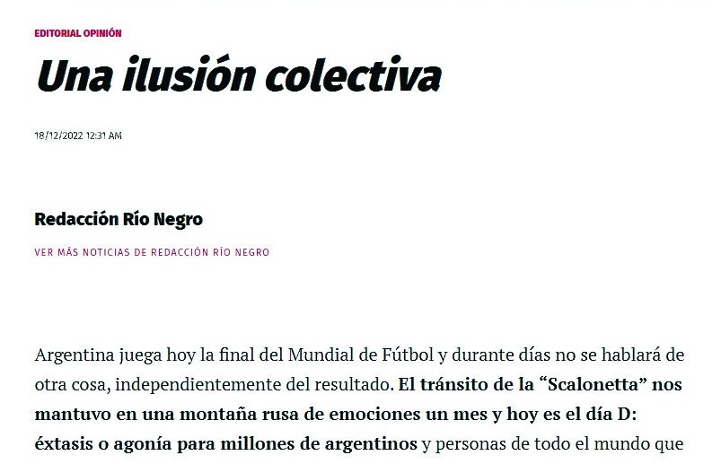 Toda ilusión es peligrosa. Si lo sabrá Freud cuando publicó en 1927 El Porvenir de una Ilusión. En estos días de evasión y catarsis, las masas artificiales utilizaron al fútbol para desclasarse. Pobres y ricos abrazados en las calles y las plazas unidos por un falso e hipócrita patriotismo que se desvanecerá, al igual que las banderitas en los autos que aparecen cada cuatro años y se esfuman al día siguiente. “Freud denominaba como de miseria psicológica de las masas a estos estados del colectivo: hoy diríamos, desvanecimiento de la libido de los sujetos sobre el colectivo al no haber ninguna significación que permita pensar en otro tipo de realidad posible. Pero lo seguro es que, corrido el telón, la realidad volverá a mostrar su rostro impiadoso, el sin futuro volverá a instalarse. La “fiesta” –patética y gloriosa– habrá terminado”. Yago Franco- Psicoanalista y Escritor.