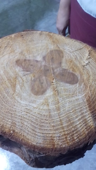 En una rodaja de un pino se puede apreciar de un lado una perfecta cruz simétrica y del otro otra impronta más pequeña con forma de mariposa.