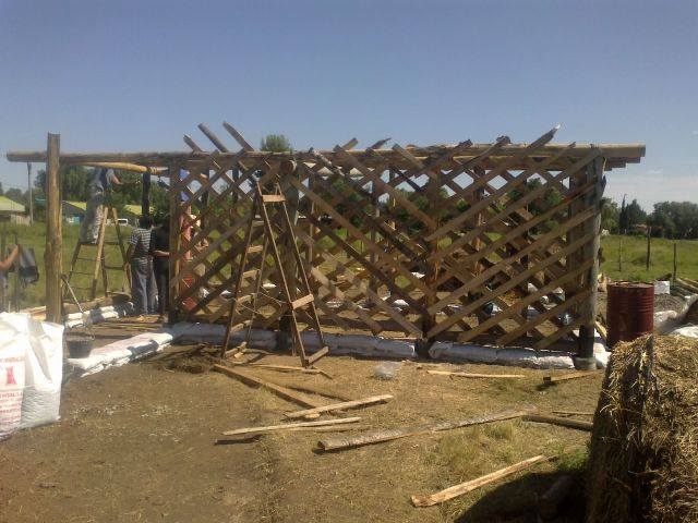 • Los cimientos – capa aisladora: con bolsas de arpillera de plástico (en las que tradicionalmente se comercializan papas), cargadas hasta ¾ con piedras de canto rodado.