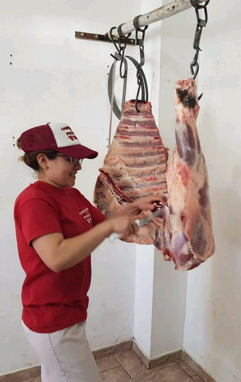Llega temprano a su carnicería ubicada en uno de los barrios más viejos de Centenario, Sarmiento. Limpia, tirar agua, acomoda la batea para despostar, hace chorizos, arma y recibe pedidos, atiende. Cuando enciende la sierra, algún cliente nuevo le dice “¿vos vas a cortar?”. Llama la atención por su solidaridad, llama la atención por ser mujer a cargo de una carnicería en una industria dominada por hombres.