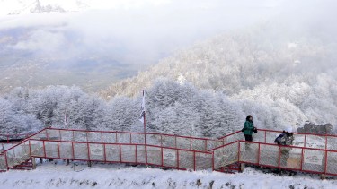Los que solo quieran contemplar la imponente vista de 360° tienen un amplio deck de madera a la izquierda del complejo y una terraza que ahora está colmada de nieve.