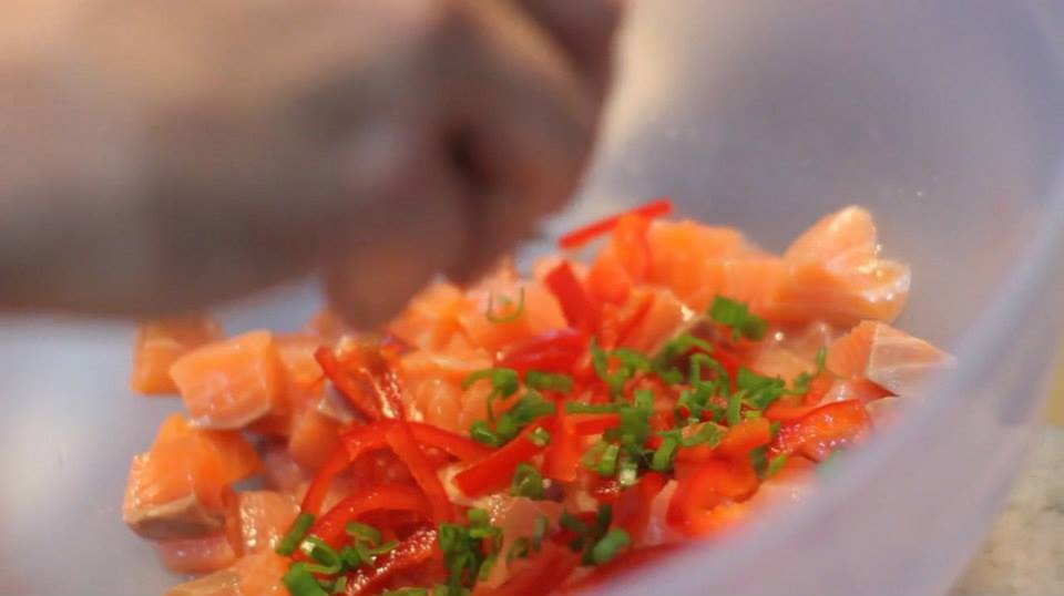 Trozar la trucha salmonada en cubitos y colocarlos en un bowl. Salar y agregar el limón, mezclar y sumarle las cebollas, volver a mezclar y agregar la leche de tigre , otra vez a mezclar y tiramos el cilantro fresco. Emplatamos formando o intentándolo, una torre con unos brotes de alfalfa encima. Agregamos jugo de limón.