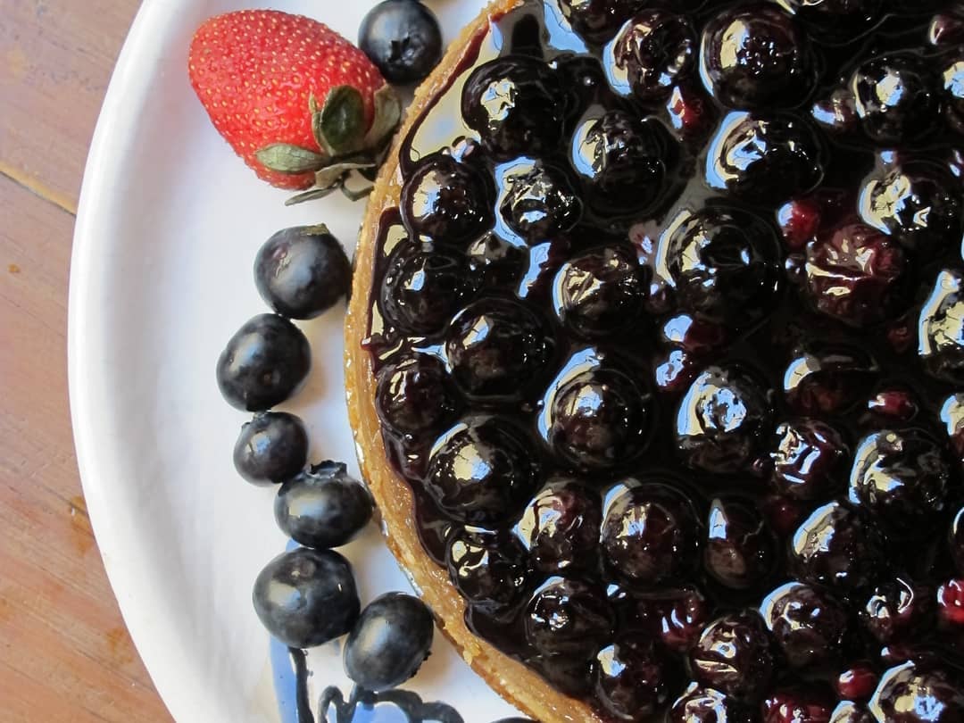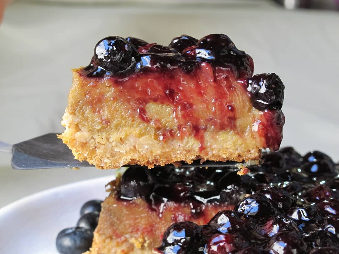 Desmoldar la torta y cubrir toda la superficie con la compota de arándanos. Servir fría.