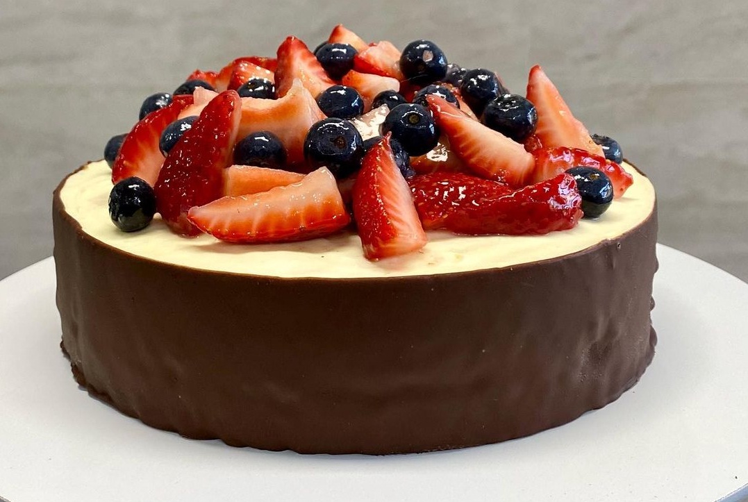 En un aro de 18 cm de diámetro formar una base con las galletas trituradas con la manteca y ralladura bien prensada. Entibiar a 40° el queso crema con la ralladura, agregar el chocolate blanco fundido y mezclar bien. Agregarle gelatina hidratada y activada con el agua. Por último integrar con movimientos envolventes la crema de leche batida a 3/4 punto (antes de chantilly), esto le dará aire y más cremosidad. Volcar sobre la base de galletas, llevar a freezer y congelar. Desmoldar y bañar con chocolate. Decorar con frutillas y arándanos. Una delicia y fácil de hacer!!