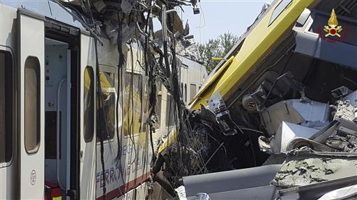 Dos trenes de pasajeros, cada uno de cuatro vagones, chocaron de frente en la sureña región italiana de Puglia, matando al menos a 20 personas. Por lo menos dos pasajeros fueron rescatados con vida de entre los escombros retorcidos. Decenas de personas resultaron heridas.