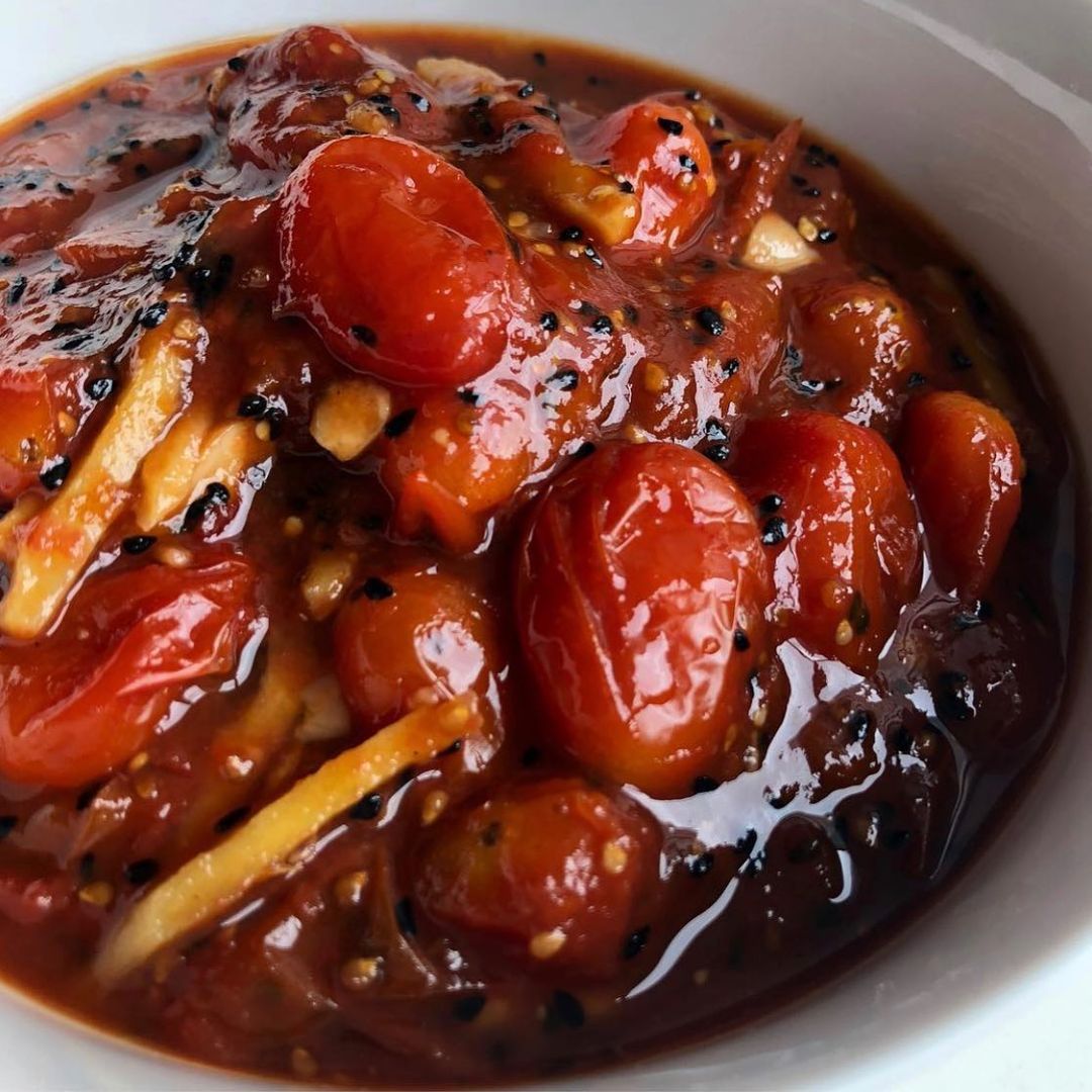 En una olla colocar los tomates cherry, el azúcar, el vinagre, el jengibre previamente pelado y cortado en bastones finitos, el ajo aplastado sin piel y las semillas de cebolla negra. Mezclar. Cocinar a fuego medio bajo revolviendo de tanto en tanto hasta que reduzca el líquido que despiden los tomates. Aproximadamente llevará entre 35 y 40 minutos. Es importante respetar la cocción baja para que los tomates mantengan la forma y no se deshagan. Dejar enfriar. Colocar en frascos esterilizados si es que se desean consumir hasta los 30 días o en un recipiente con tapa hermética para consumir dentro de una semana. Conservar refrigerado.