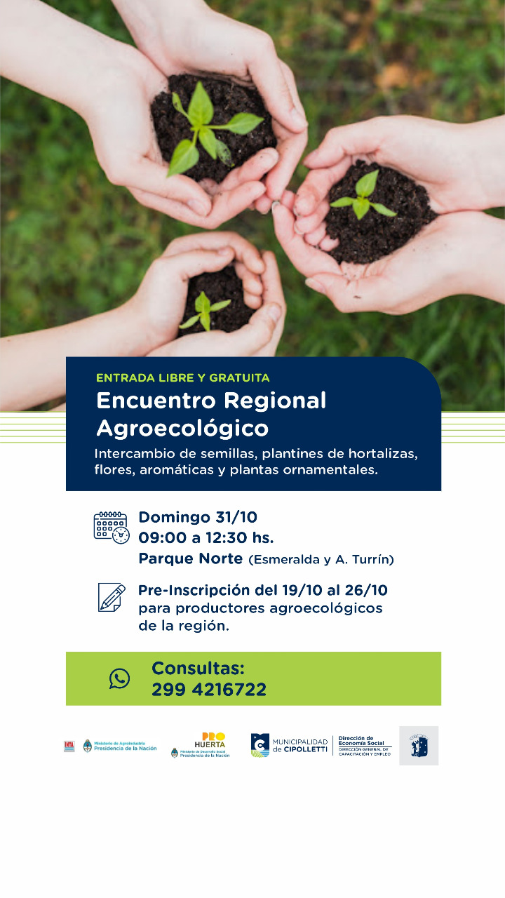 El día 31 de octubre, el INTA y ProHuerta Cipolletti, junto con la Dirección general de capacitación y la Dirección de Economía Social de la municipalidad de Cipolletti, invitan al Encuentro Regional Agroecológico. El evento será de 9 a 12.30 en Parque Norte, Esmeralda y Turrín, de la ciudad.