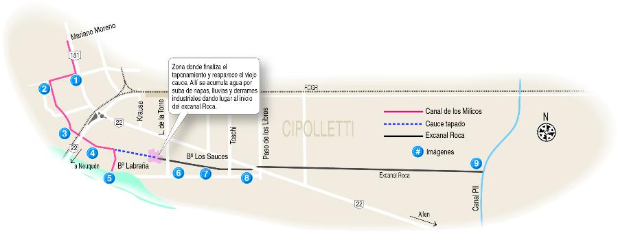 “El Canal de los Milicos arranca en Cinco Esquinas, corre paralelo a la Ruta 151, pasa por debajo de la Policía Caminera, llega al barrio Labraña y desagua en un brazo del Neuquén”, detalló Artero. Respecto del ex-Roca dijo que tiene su nacimiento en Lisandro de la Torre al fondo y que luego corre paralelo al sur de la Ruta Nacional 22, en un momento cruza a la margen norte, y sigue hasta Puente 83. Aseguró que el agua que arrastra es producto de las filtraciones de las napas, de los pozos sépticos y que sirve de drenaje para las empresas que están sobre la Ruta 22 “desde la calle Estado de Israel hasta (Benigno) Gallucci”, detalló.