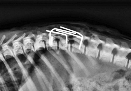 También por la corta edad de Malta, la cicatrización sería rápida y, al encontrarse en crecimiento, los implantes deberán ser retirados, apenas consolide la fractura para evitar que interfieran con el normal desarrollo de su columna.