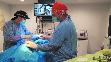 En este caso, el profesional eligió la fijación con clavijas y PMM (Polimetil metacrilato) y enclavijamiento de titanium, con la asistencia y la responsabilidad de la anestesia del veterinario Jorge Pablo Vaccari.