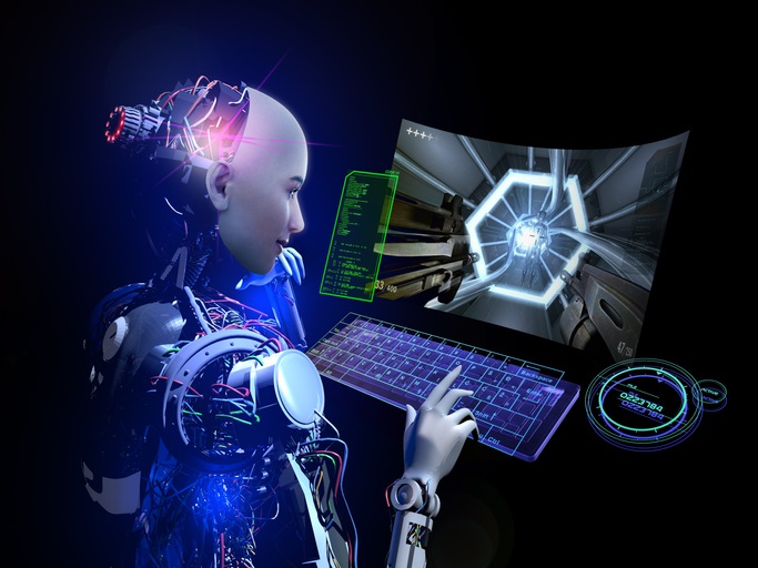 Human face cyborg is playing a virtual game.