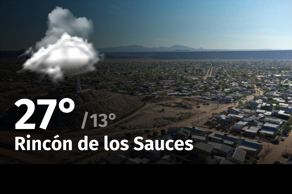 Para esta jornada el pronóstico del tiempo para la ciudad de Rincón de los Sauces indica nubes con una temperatura máxima de 27 °C y una temperatura mínima de 13 °C.