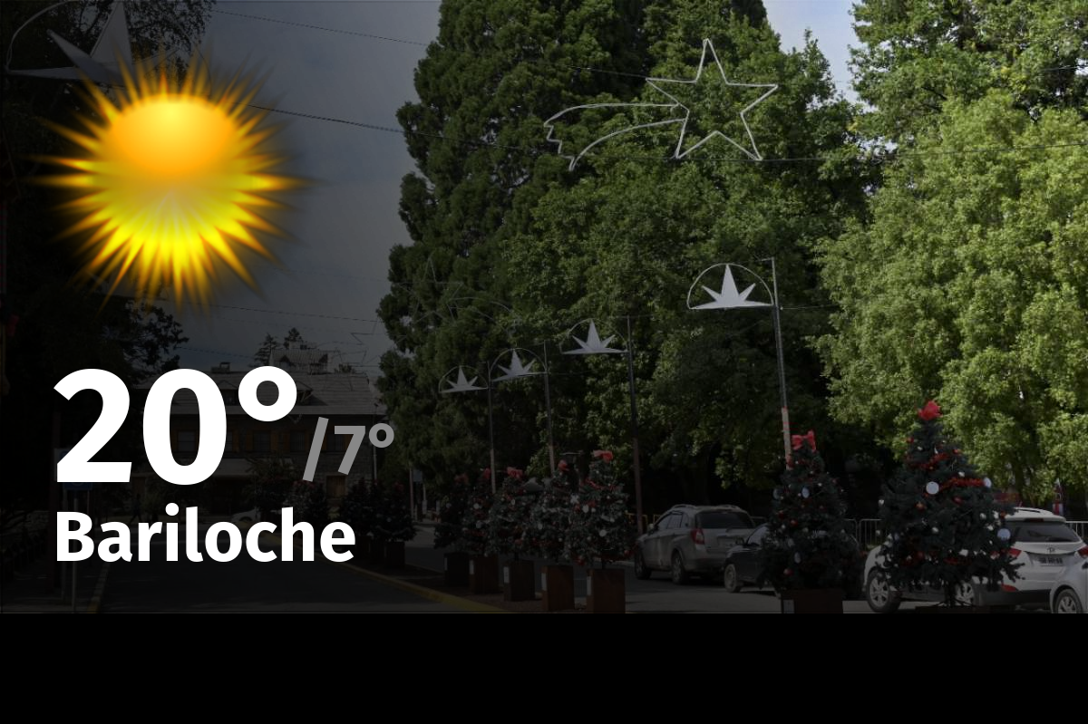 Para esta jornada el pronóstico del tiempo para la ciudad de Bariloche indica cielo claro con una temperatura máxima de 20 °C y una temperatura mínima de 7 °C.