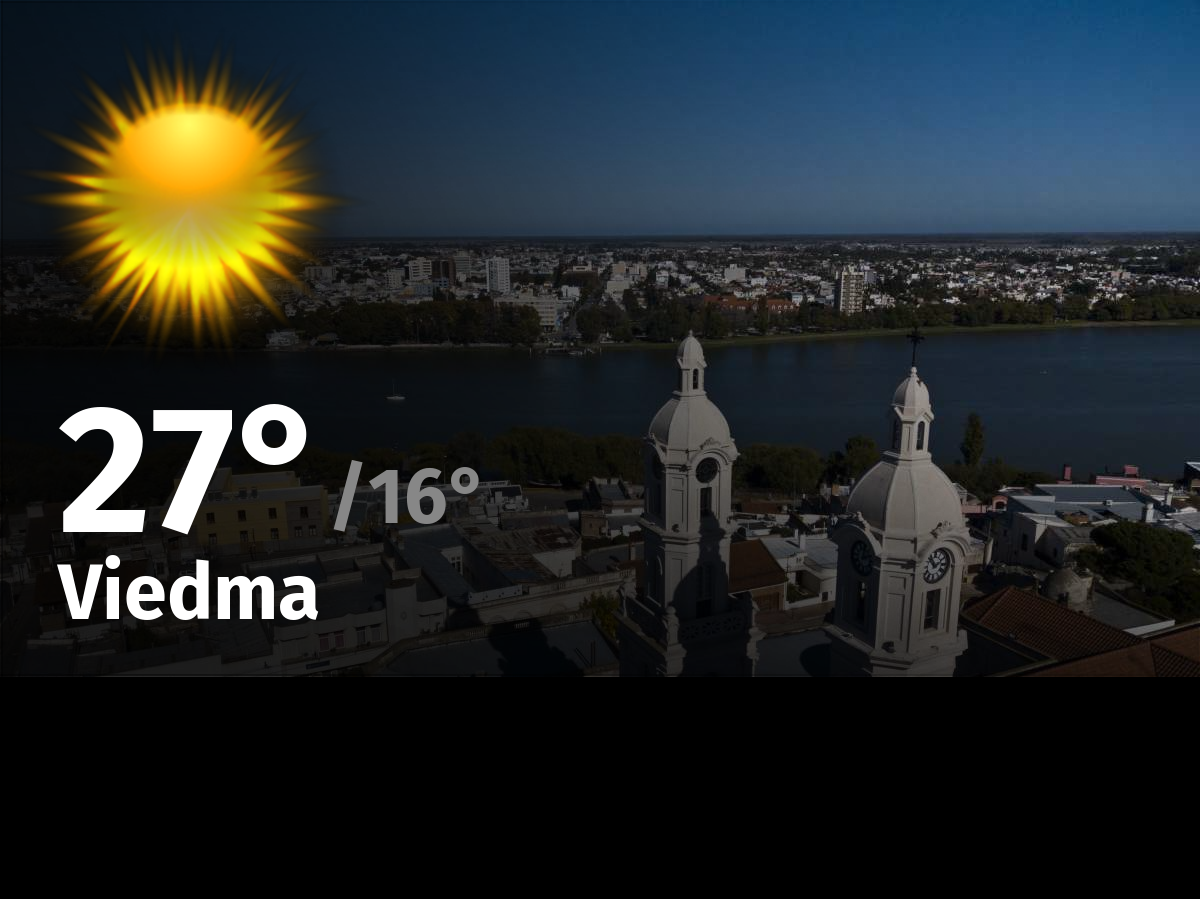 Para esta jornada el pronóstico del tiempo para la ciudad de Viedma indica cielo claro con una temperatura máxima de 27 °C y una temperatura mínima de 16 °C.